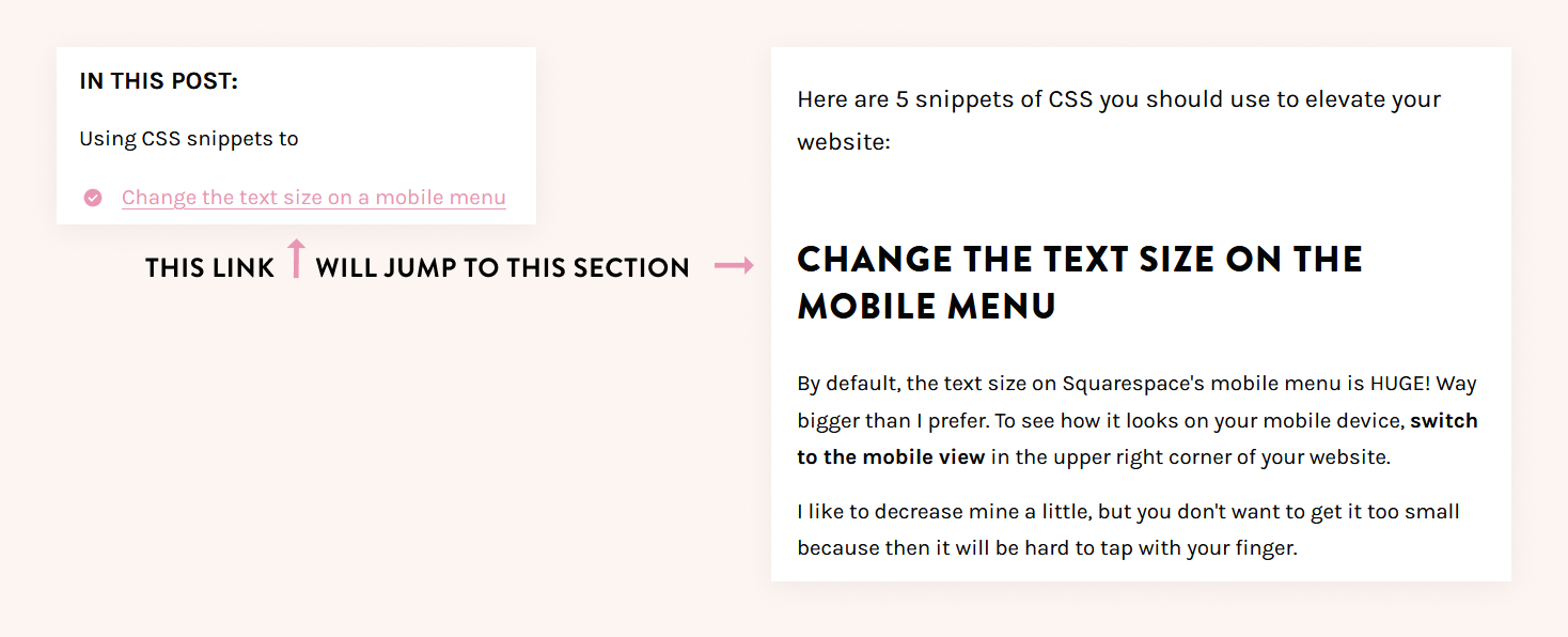 I'm going to walk through how I created anchor links for this blog post. I have a table of contents at the top of the page and I want the first link ("Change the text size on a mobile menu") to jump to the "Change the text size" section.